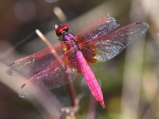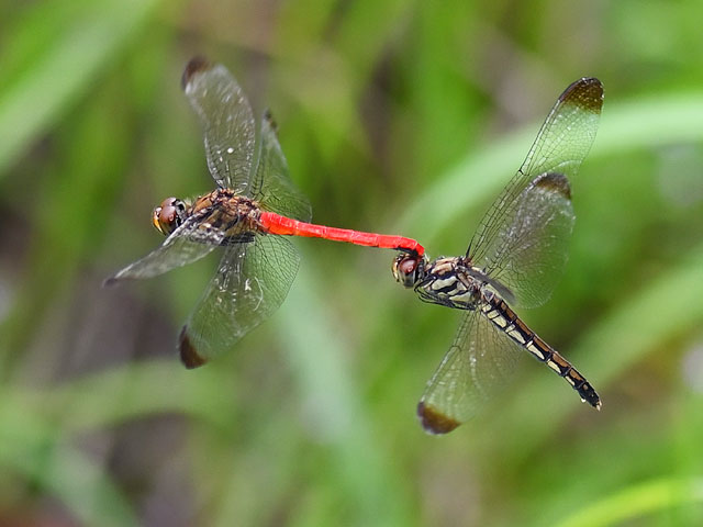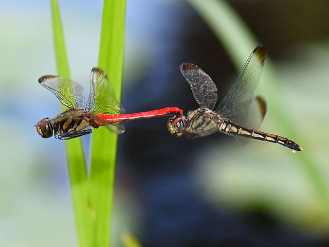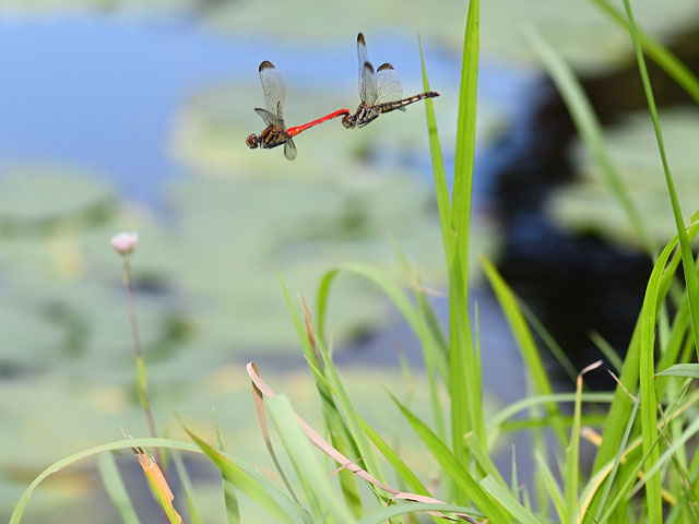 ▲池横の草地で連結打空産卵するリスアカネ.▲