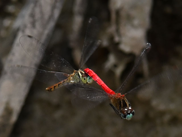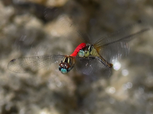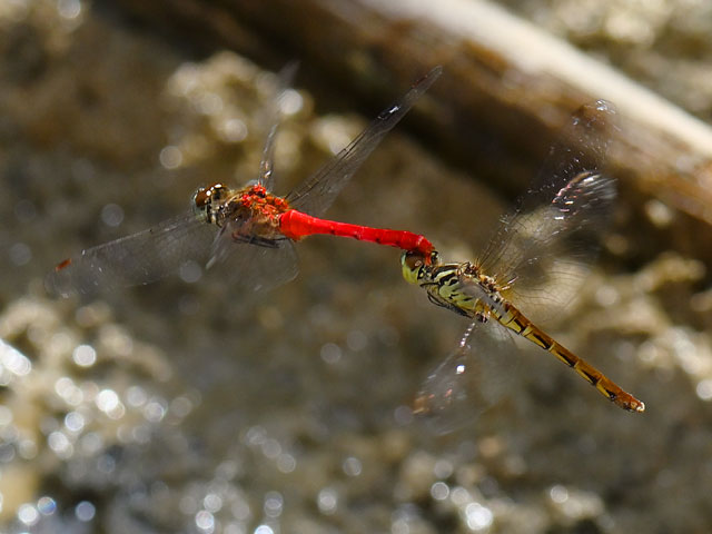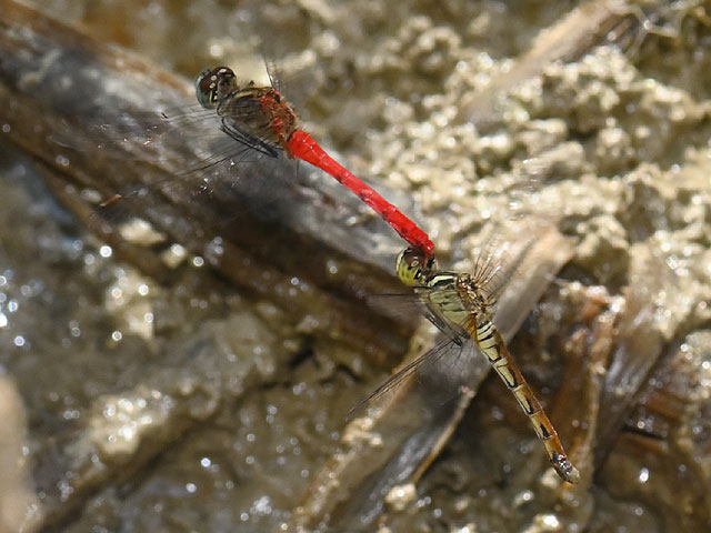 秋のトンボが出始めています.そんな中,シオカラトンボがアオイトトンボを食って,頭だけがポロリ.ホラー映像のようです.