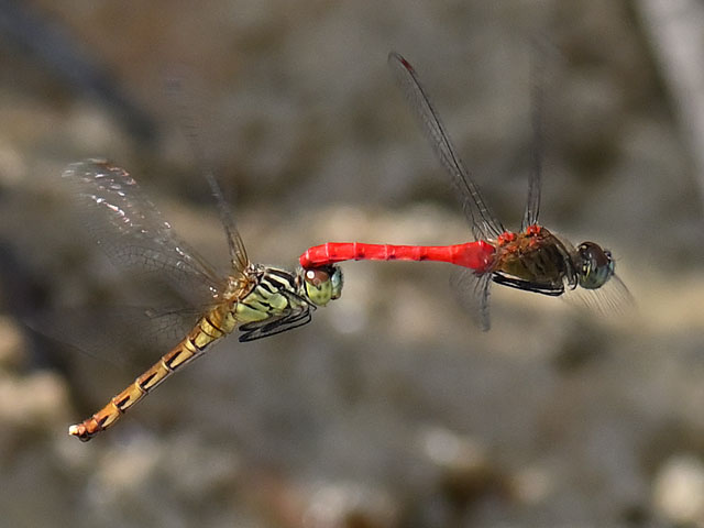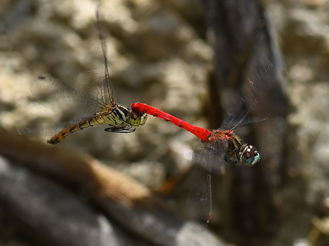 ▲マイコアカネのオスとメス.メスは翅の付け根がオレンジ色である.▲