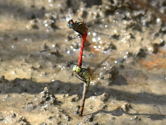 次はナニワトンボです.ただマイコアカネの産卵に出会ったため,時間が過ぎてしまいました.こちらは産卵を見るのは無理でしょうね.案の定,次の池に着いたとき,ナニワトンボは,オスが池岸で,飛んだり止まったりしているだけでした.