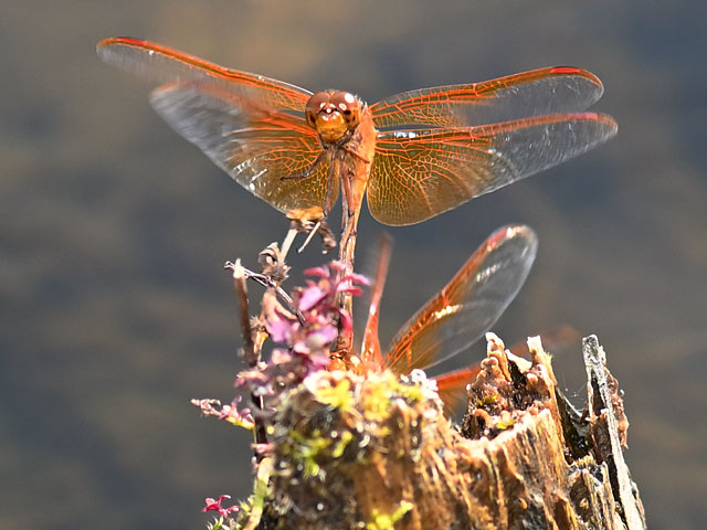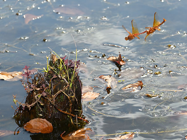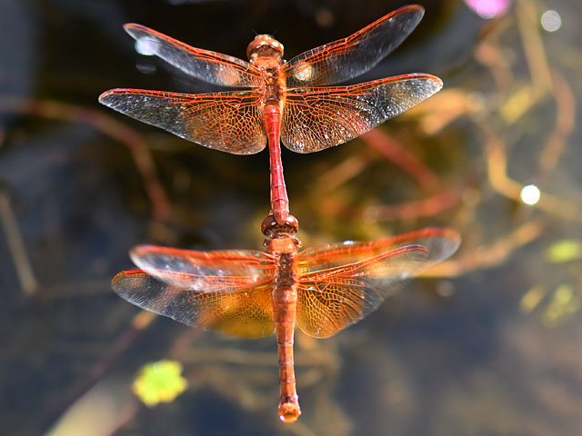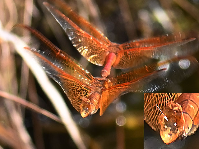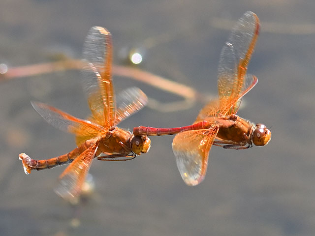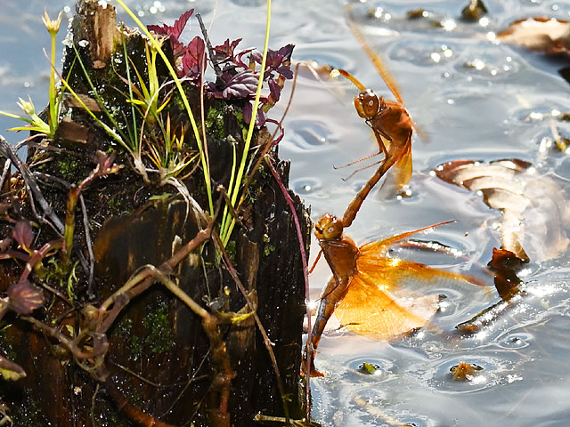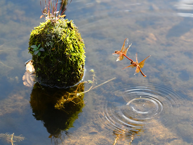 ▲産卵するキトンボのペア.打水した直後て水滴が落ちている.▲