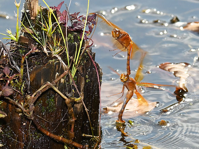 ▲産卵するキトンボのペア.打水した直後て水滴が落ちている.▲