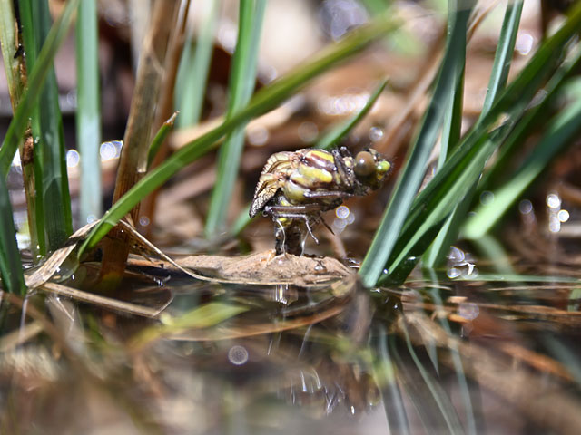 フタスジサナエは,羽化殻が10個以上付いていました.よく水際を観察すると2頭,羽化途中でした.ちょっと時間が遅かった感じです.もう少し早く来ればたくさんの羽化が見られたように思います.