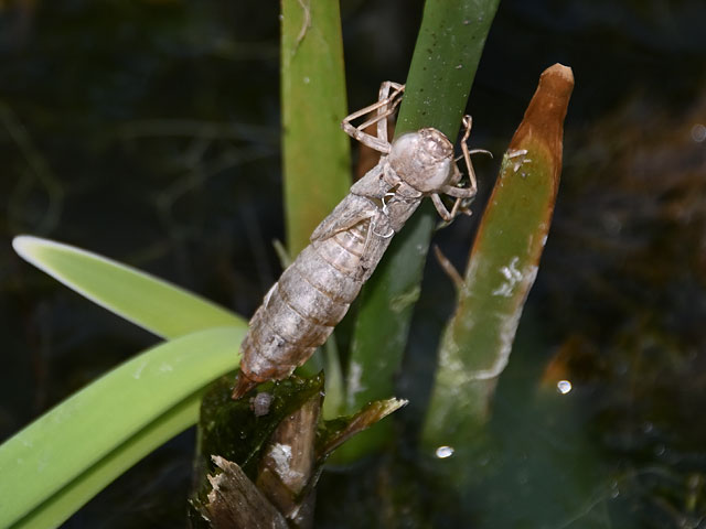 他にいないか探しましたが成虫は見えず.しかしクロスジギンヤンマのものと思われる羽化殻が付いていました.もう出ているんだ.早い! 本来なら採取して種名を確かめるところですが,取ることができない位置にありました.