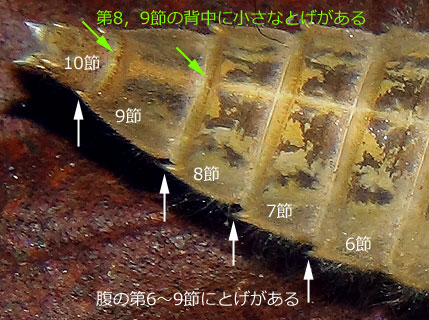 背棘:はいきょく)が,第8節と9節の背中の部分に見えます.ただし,これもときどき第8節のとげがないことがあります.