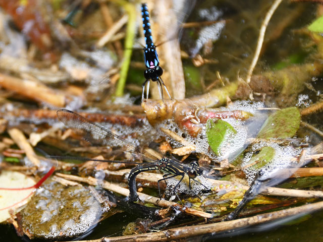 しばらく観察していると,メスがおもむろに飛び立ち,産卵を始めました.こういう普通種でも,産卵を見るのはそれなりの幸運が必要です.まず見つけるのが結構大変です.実際,スキバハナダカトンボより数多くいたナカハグロトンボの産卵は見つけることができませんでした.